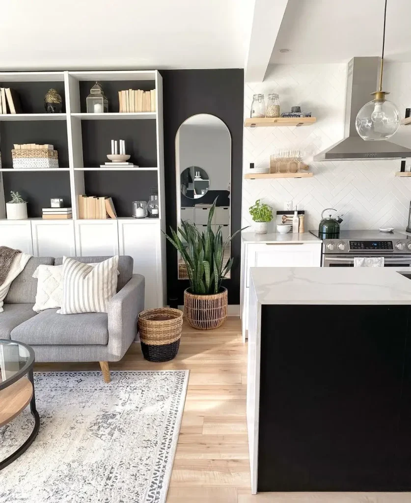 This grey living room seamlessly blends into a kitchen and dining area, featuring a sleek grey sofa with patterned pillows, a patterned rug, and a modern bookshelf against a bold black accent wall. The space is elevated with natural elements like a potted plant and wooden flooring.