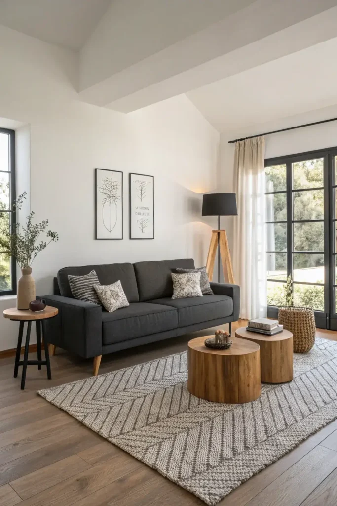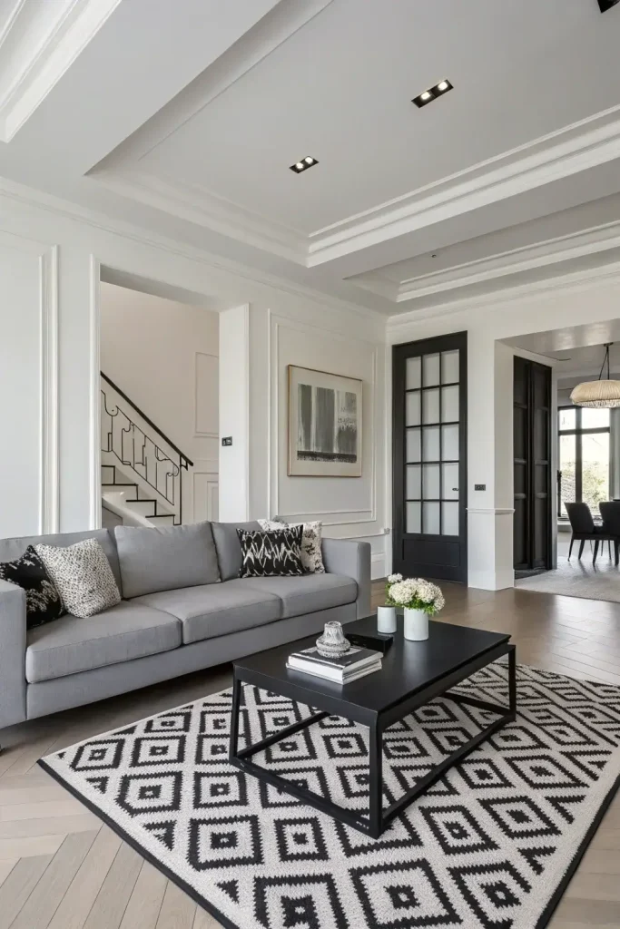 This high-contrast combo feels bold yet balanced. Start with a medium grey sofa as your base, then layer in black and white decor: black picture frames, white ceramic vases, and a patterned black-and-white rug. A black coffee table anchors the room, while white accessories add crispness. It’s a sleek setup that channels both modern living room ideas and classic sophistication.