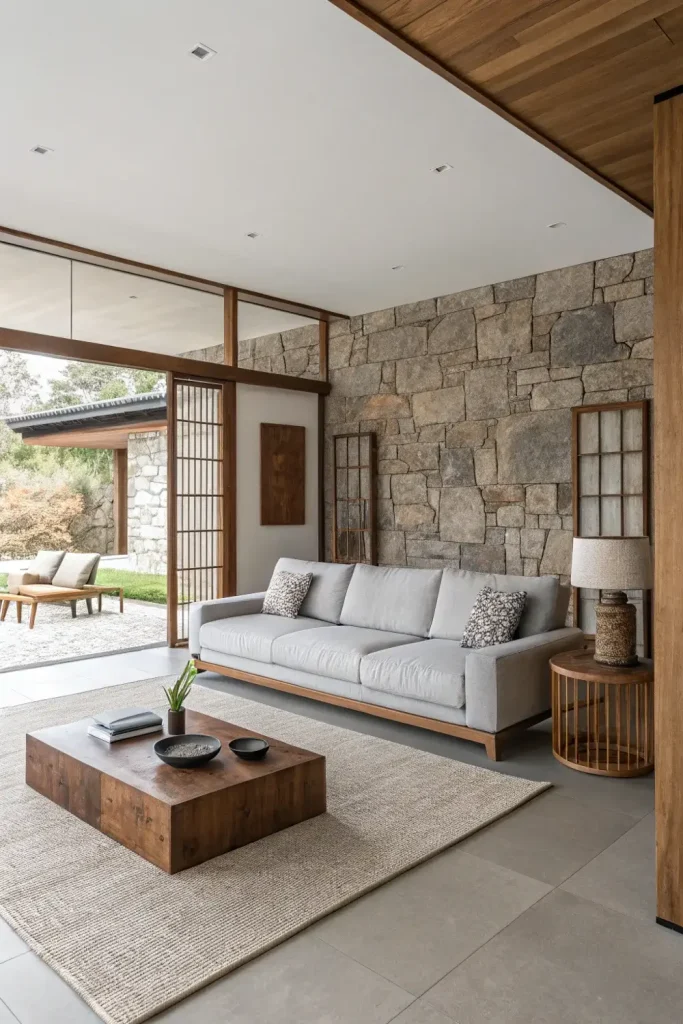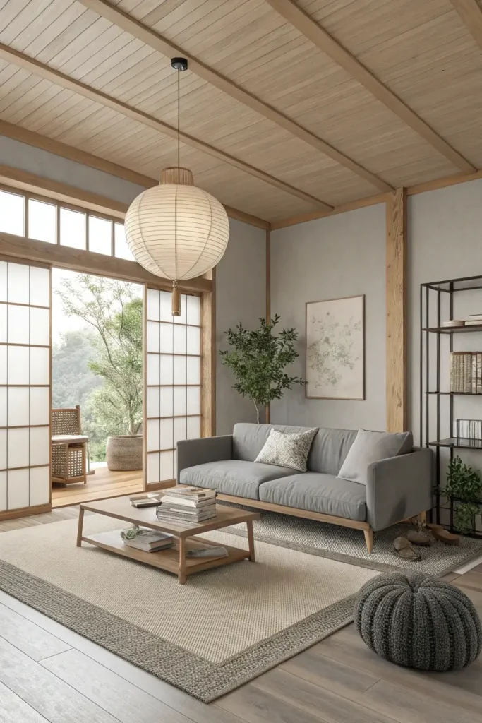 Japandi interiors celebrate calm, simplicity, and natural materials. Choose a low, sleek grey sofa with clean lines and style it with neutral-toned wood furniture, paper lantern lighting, and soft textiles in muted tones. Keep the palette simple: stone, taupe, ash, and of course, layers of grey. This serene living room inspiration is perfect for slowing down and savoring your space.