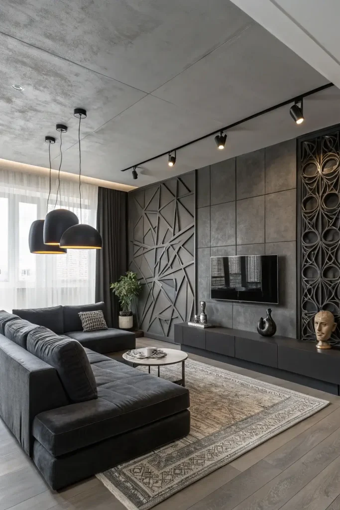 For a bolder look, layer different tones of grey with matte black accents. Combine a dark grey sofa with black metal lighting, geometric wall art, and sculptural décor. Stick to a monochrome palette for that sleek, modern living room decor vibe, and add warmth with a wool rug or dark wood flooring. This look thrives on clean lines and contrast, perfect for lovers of urban loft aesthetics and masculine energy.