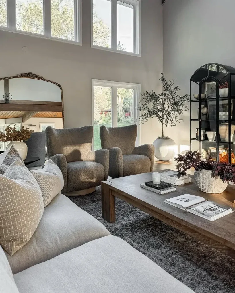 A grey living room with plush chairs and a light sofa, complemented by a wooden coffee table and potted plants. The large windows and neutral tones create a bright, airy feel.