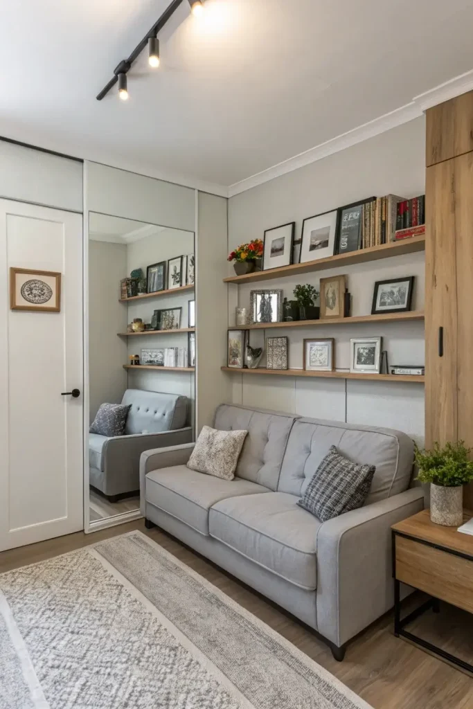 In apartment living room inspiration, versatility is key—and grey delivers. A soft grey couch works wonders in small spaces. Choose a sectional or loveseat that doesn’t overpower, and keep the walls in a similar hue for a seamless effect. Use mirrors to bounce light and keep accessories minimal. Think layered neutrals, floating shelves, and a simple TV wall decor setup to maximize every inch.