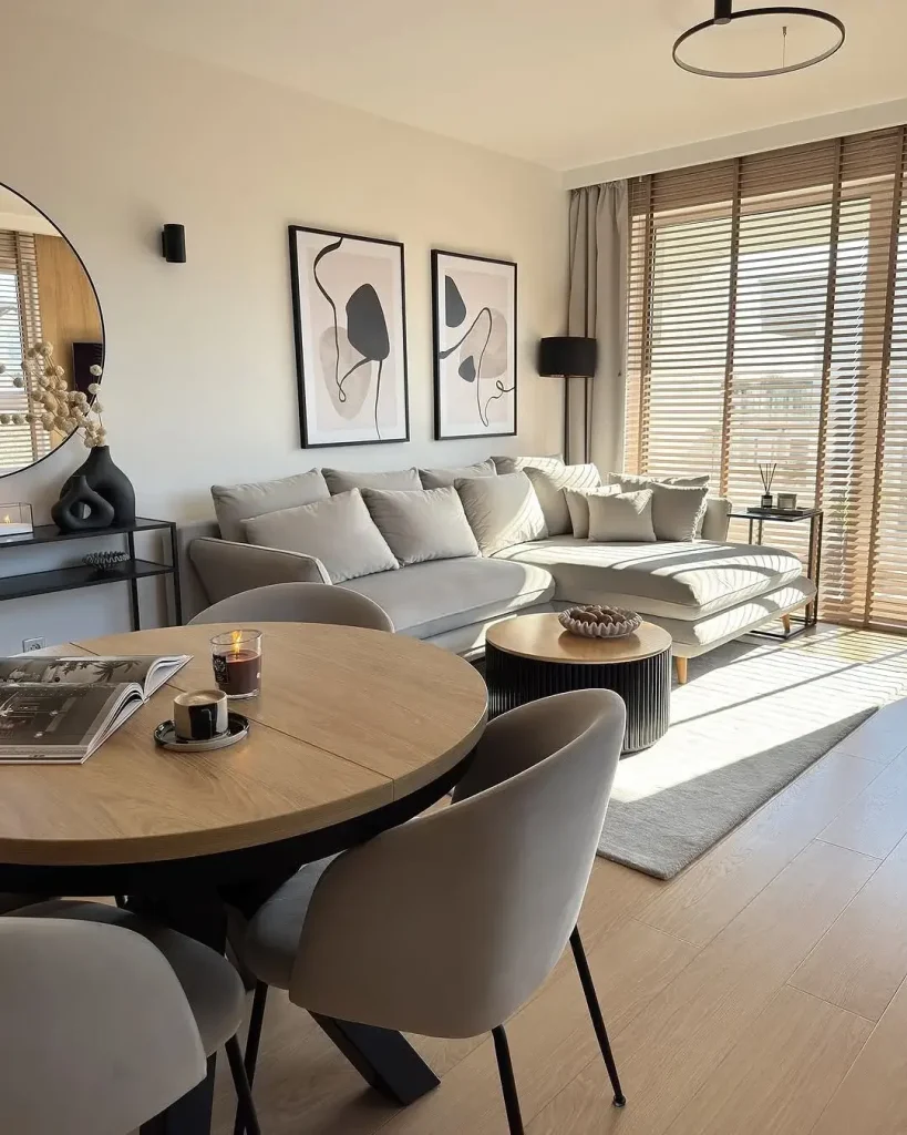 A grey sectional sofa in a sunlit room with wooden blinds and minimalist art. The round dining table and soft grey chairs create a cohesive, inviting atmosphere.