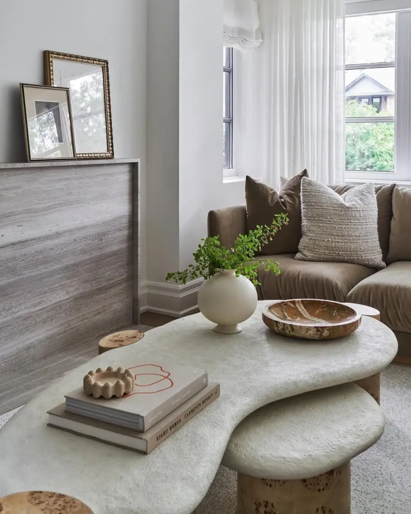 This grey living room features a plush brown sofa with textured pillows, paired with a unique marble coffee table. A white vase with greenery and a decorative bowl add elegance, while a marble accent wall and framed mirrors enhance the modern aesthetic.