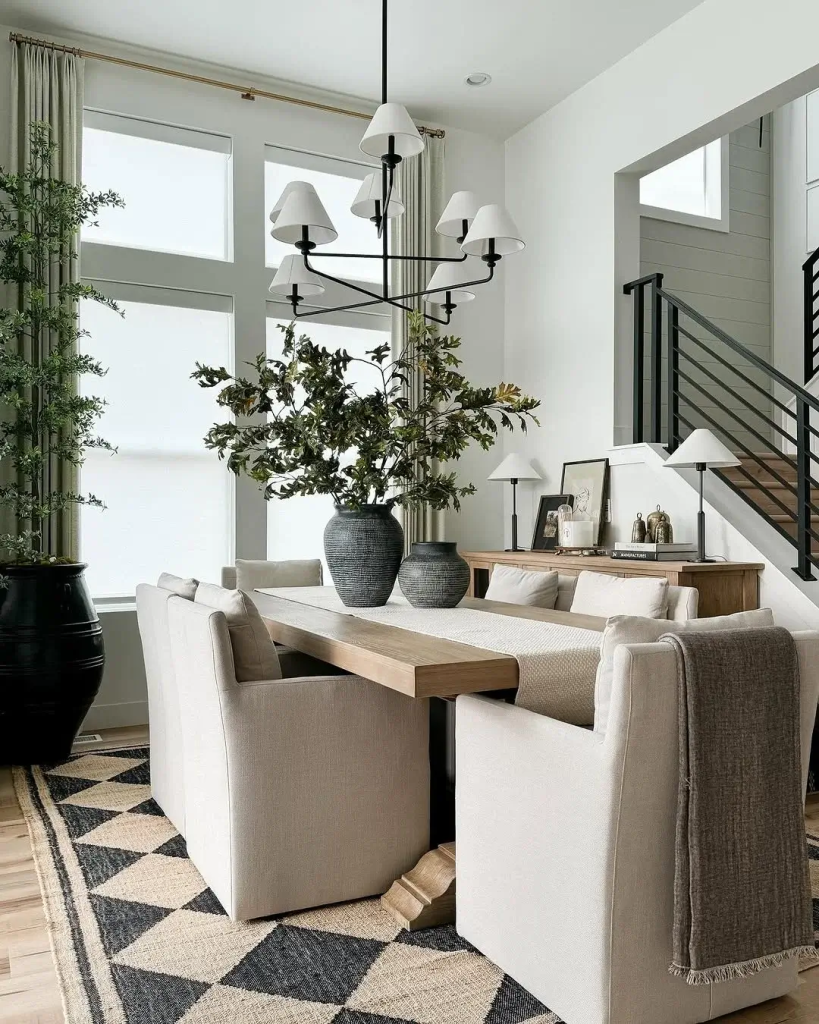 A grey dining area with a wooden table surrounded by light grey upholstered chairs. The space is decorated with large vases filled with greenery, a modern chandelier, and a patterned rug, adding a touch of sophistication to the minimalist design.